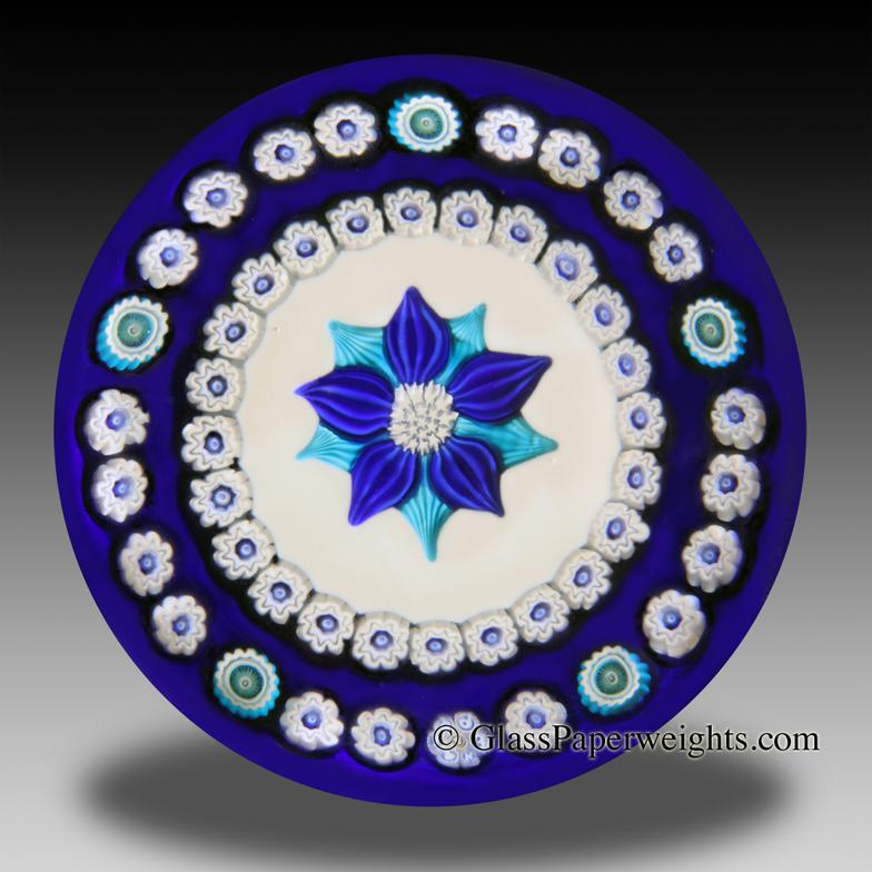 Most Parabelle weights are millefiori designs, though sometimes lampwork nosegays or flowers would make their appearance with the millefiori. Most Parabelle weights were made in small limited editions of from 10 to 25 pieces, with some early editions as large as fifty. Special weights include double overlays, piedouches, baskets with or without a handle and triple weights in the manner of Baccarat.